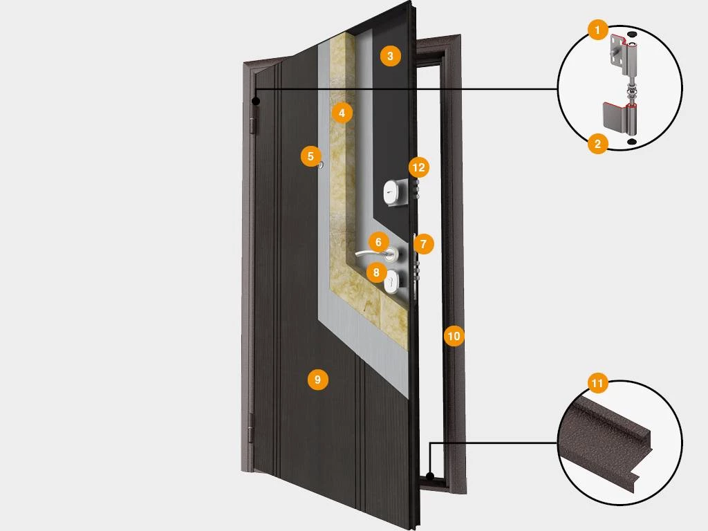 - снаружи полотно покрыто антивандальной порошковой краской цвета «антик медь» и имеет декоративный оттиск «симметрия»; изнутри на полотно наносится ПВХ-пленка цвета «венге» или «капучино мелинга»;