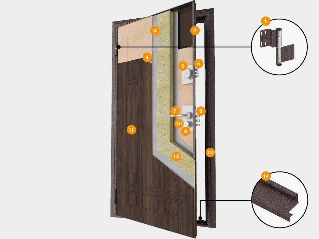 Модель комплектуется двумя замками BORDER с 4-ым (высшим) классом защиты, имеет ручку на раздельной планке и броненакладку для защиты цилиндра. На выбор предлагается два варианта отделки: с облицовкой фрезерованной панелью МДФ с 2-х сторон; и более бюджетный вариант — с облицовкой МДФ только с внутренней стороны. При этом снаружи дверь будет иметь антивандальное порошковое покрытие цвета «антик медь», которое не царапается и долго сохраняет эстетичный внешний вид.